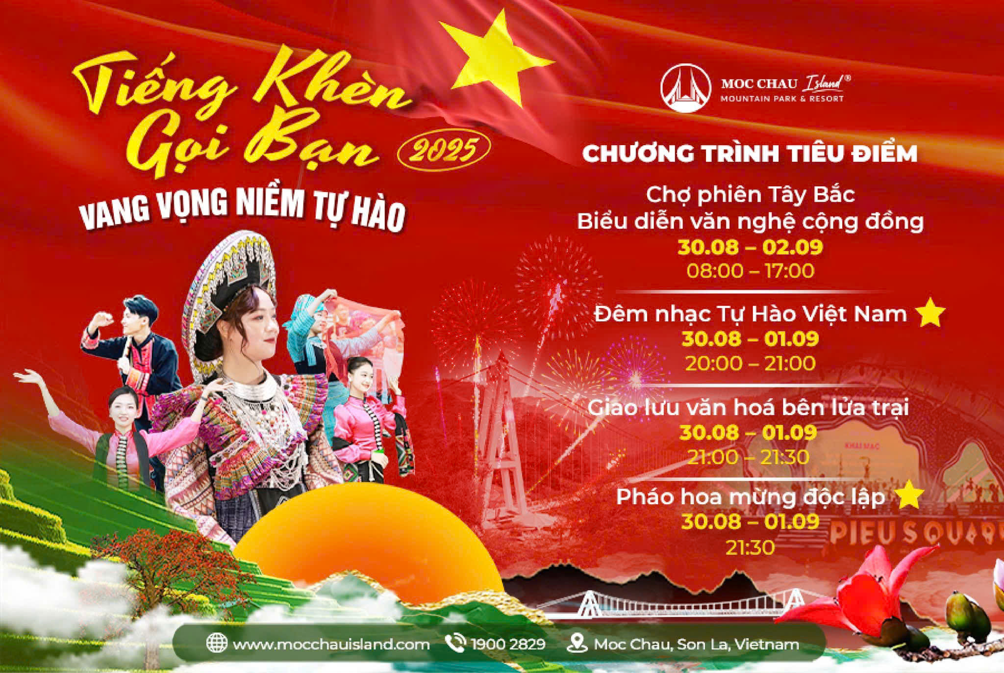 Celebrating 80 glorious years of national pride, Moc Chau Island proudly presents the ‘Call of the Khen 2025 Fair’ — resounding with songs of Independence and Pride. Thousands of red flags with golden stars will flutter in the night sky, igniting the patriotic spirit in the grand concert themed Pride of Vietnam.